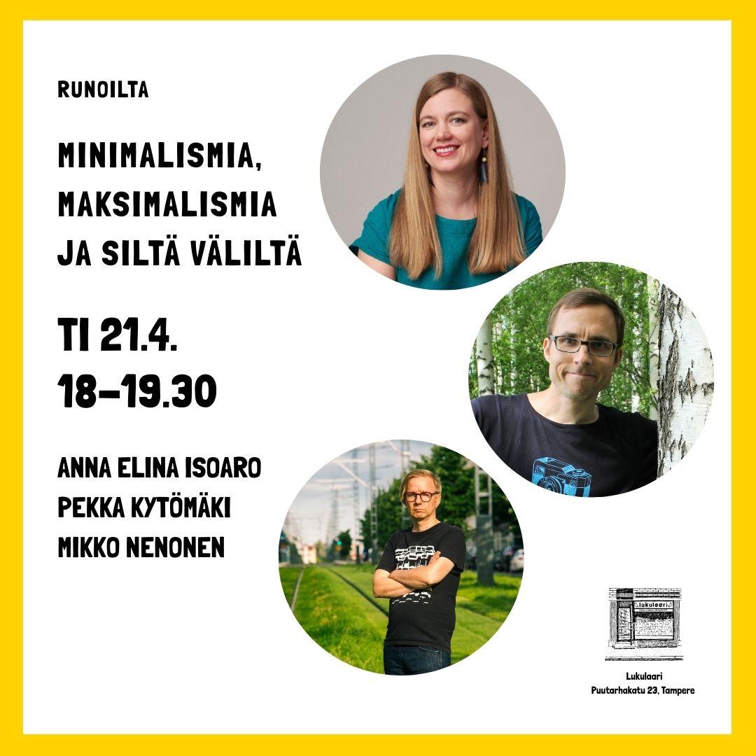 Runous saapuu Lukulaariin, kun kolme valloittavaa kirjailijaa valtaa lavan huhtikuun illassa. Luvassa on keskenään hyvin erilaisia esityksiä, ja jokainen voi itse päättää, mihin illan teemassa mainittuun kategoriaan kukin esiintyjistä asettuu. Mukana ovat Pirkkalaiskirjailijoistakin tutut Anna Elina Isoaro, Pekka Kytömäki ja Mikko Nenonen.